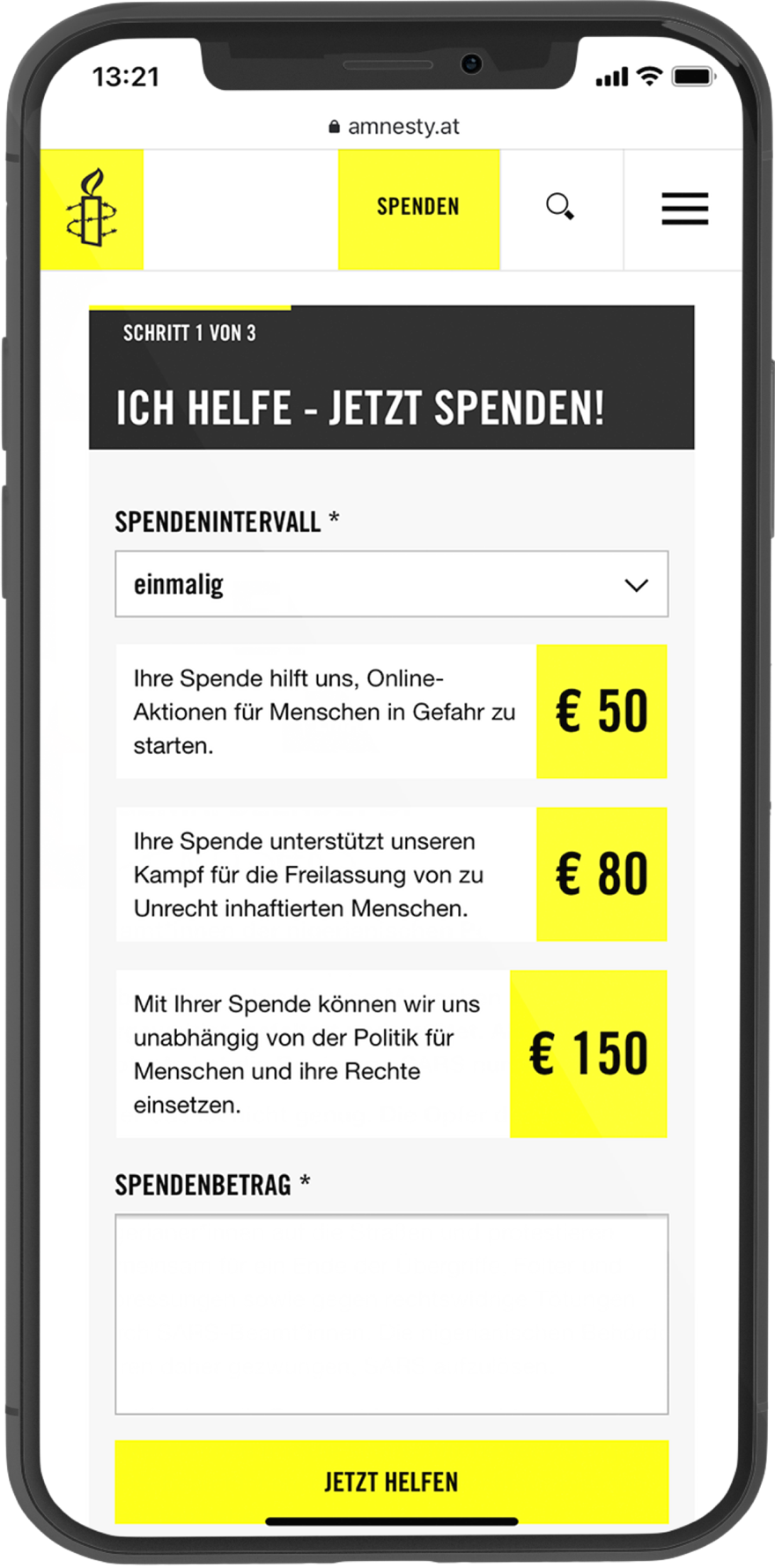 Um die Arbeit von Amnesty International jederzeit und überall aktiv unterstützen zu können wurde bei der Umsetzung auf eine optimale Bedienbarkeit auf mobilen Endgeräten geachtet.